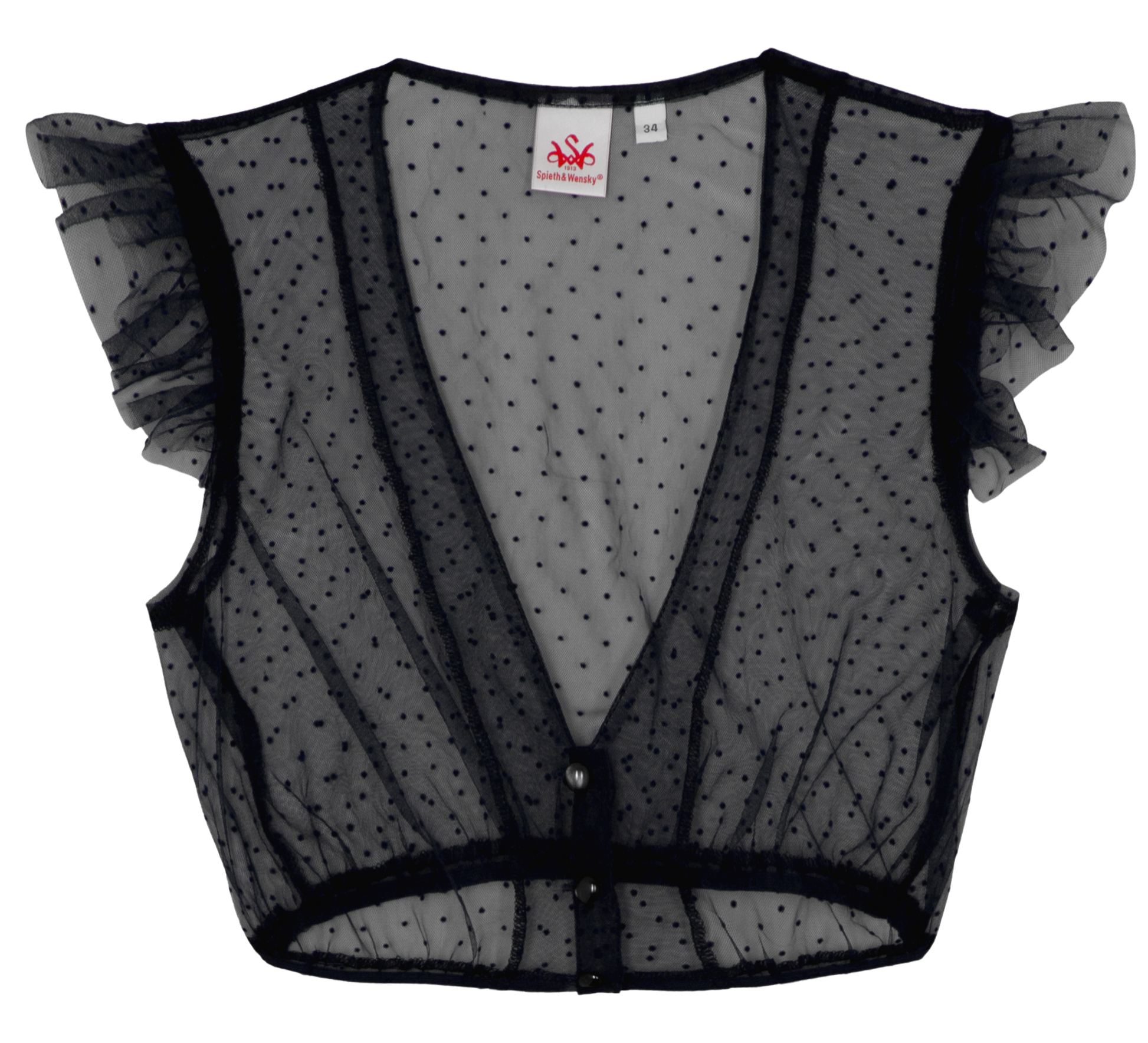 Die elegant transparente Bluse besticht durch ein verspieltes Punktemuster und feinen Spitzenstoff. Tiefer V-Ausschnitt, kurze Ärmel und eine elegante 3er-Knopfleiste sorgen für eine luxuriöse Optik vereint mit höchstem Tragekomfort. Gepunktet, transparent und absolut schick – dieses Stück setzt dein Dirndl in Szene.